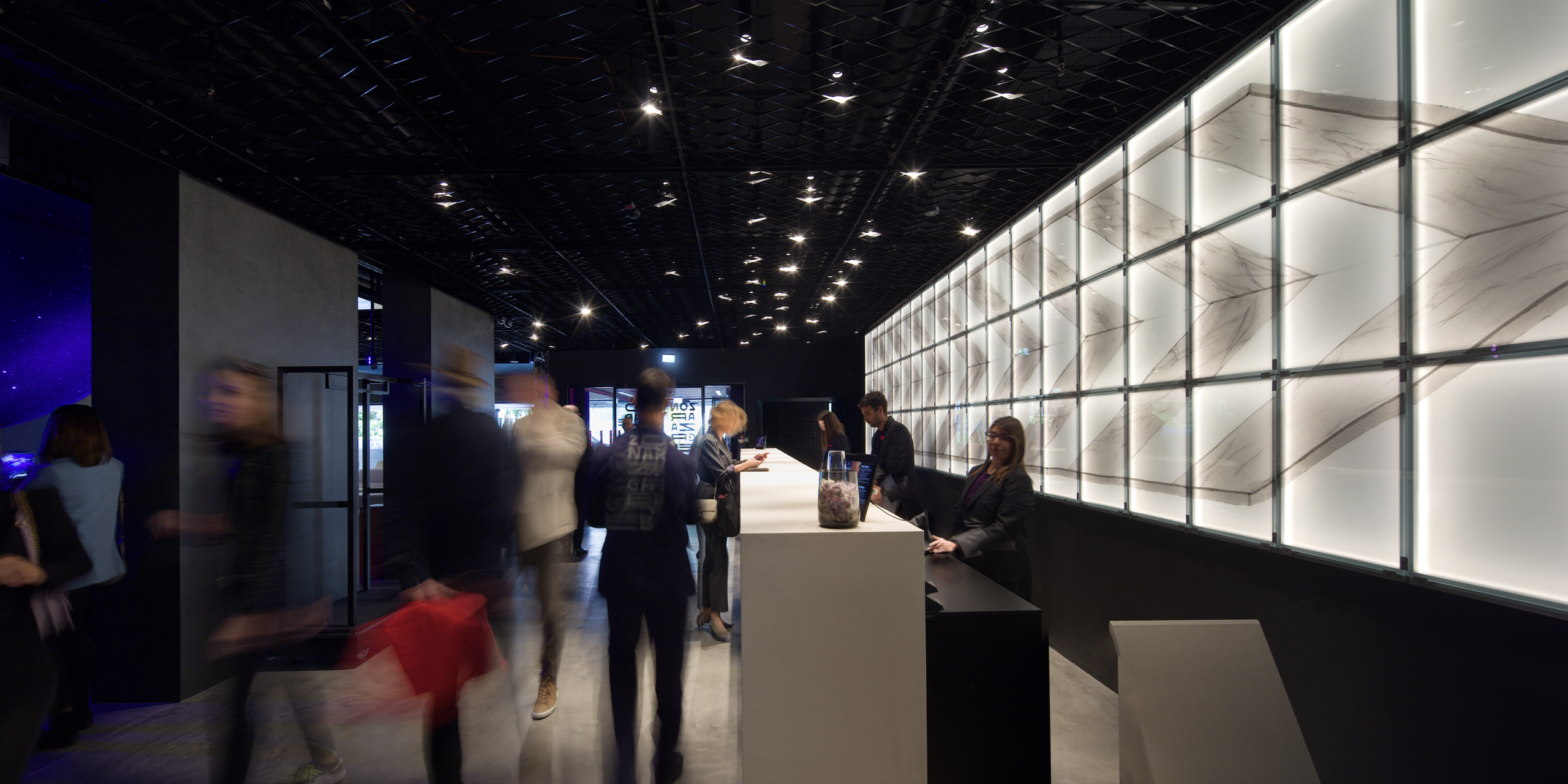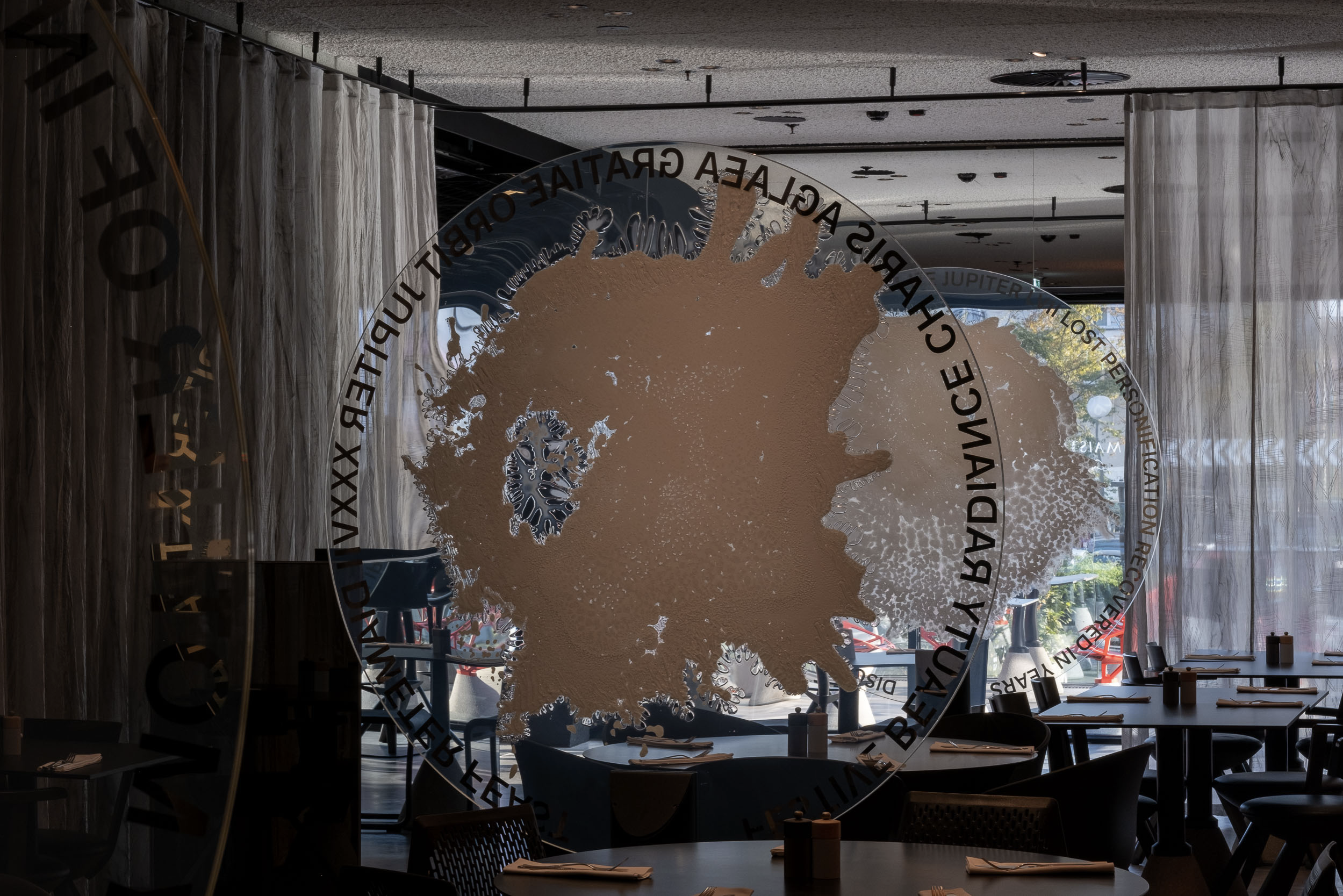 Within the restaurant space, circular glass elements introduce a contrasting spatial gesture. These glass discs contain laminated crystal structures combined with mirrored text elements, creating surfaces that interact with light, reflection, and movement. The circular compositions function simultaneously as graphic elements and reflective spatial markers, adding visual rhythm to the interior.