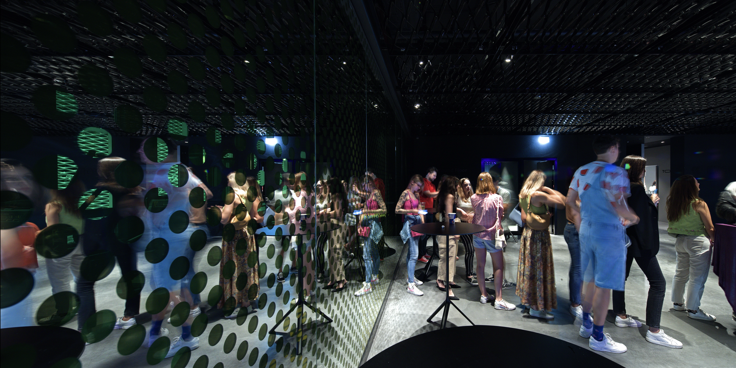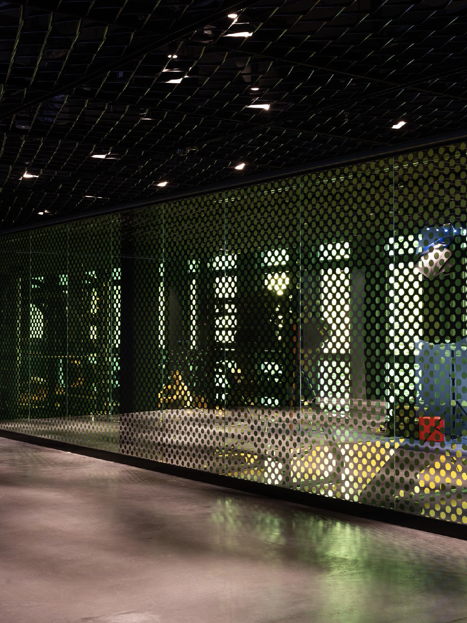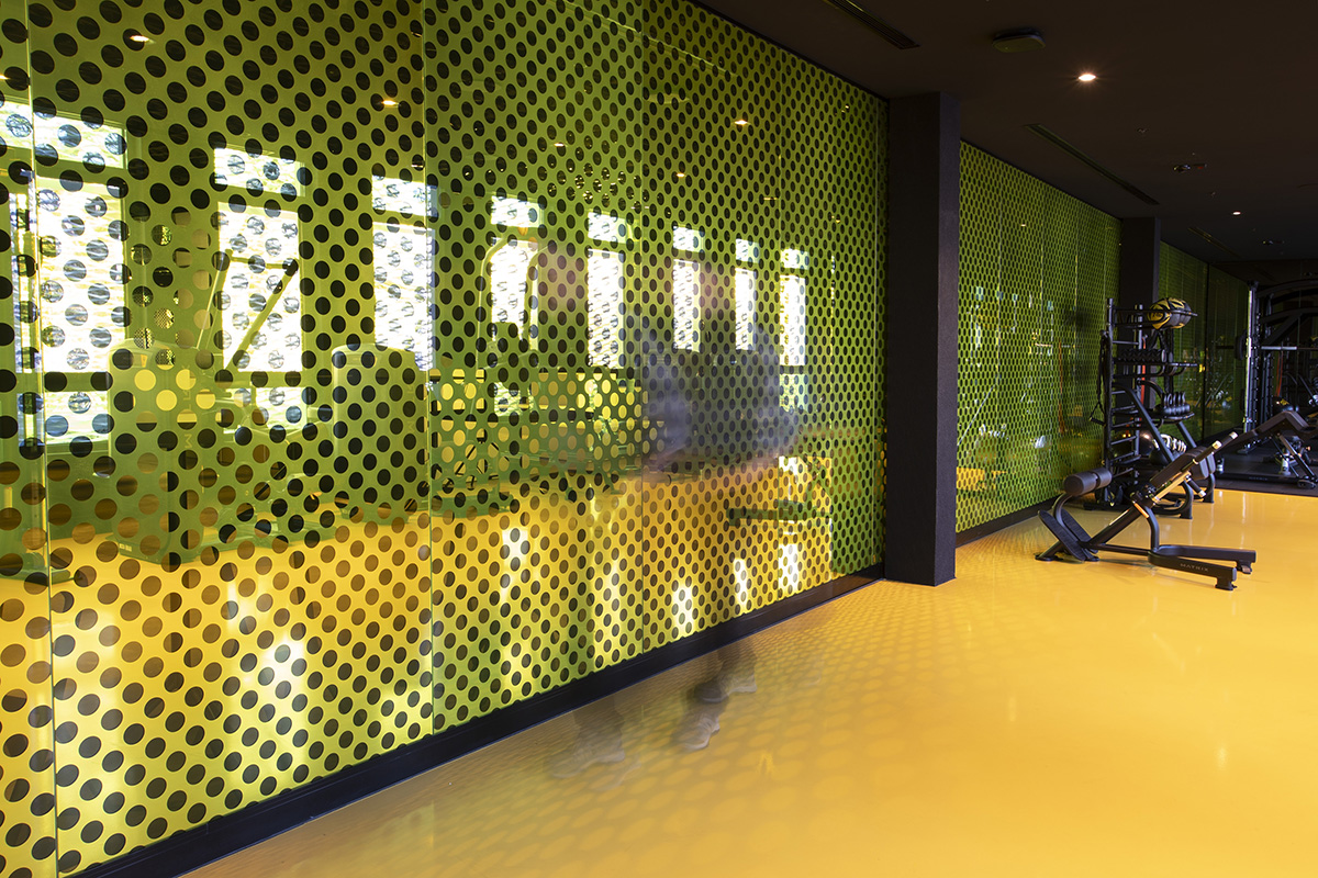 On the first floor, the gym is separated from the adjacent event space through a series of laminated glass partitions featuring a perforated dot motif. The glass contains a laminated yellow UV filter combined with mirrored negative circles. This layered construction produces a dual visual effect: from one side the surface appears yellow-golden, while from the opposite side it reads as yellow-silver. The perforated pattern allows light and movement to pass through the surface while maintaining spatial separation between the two zones.